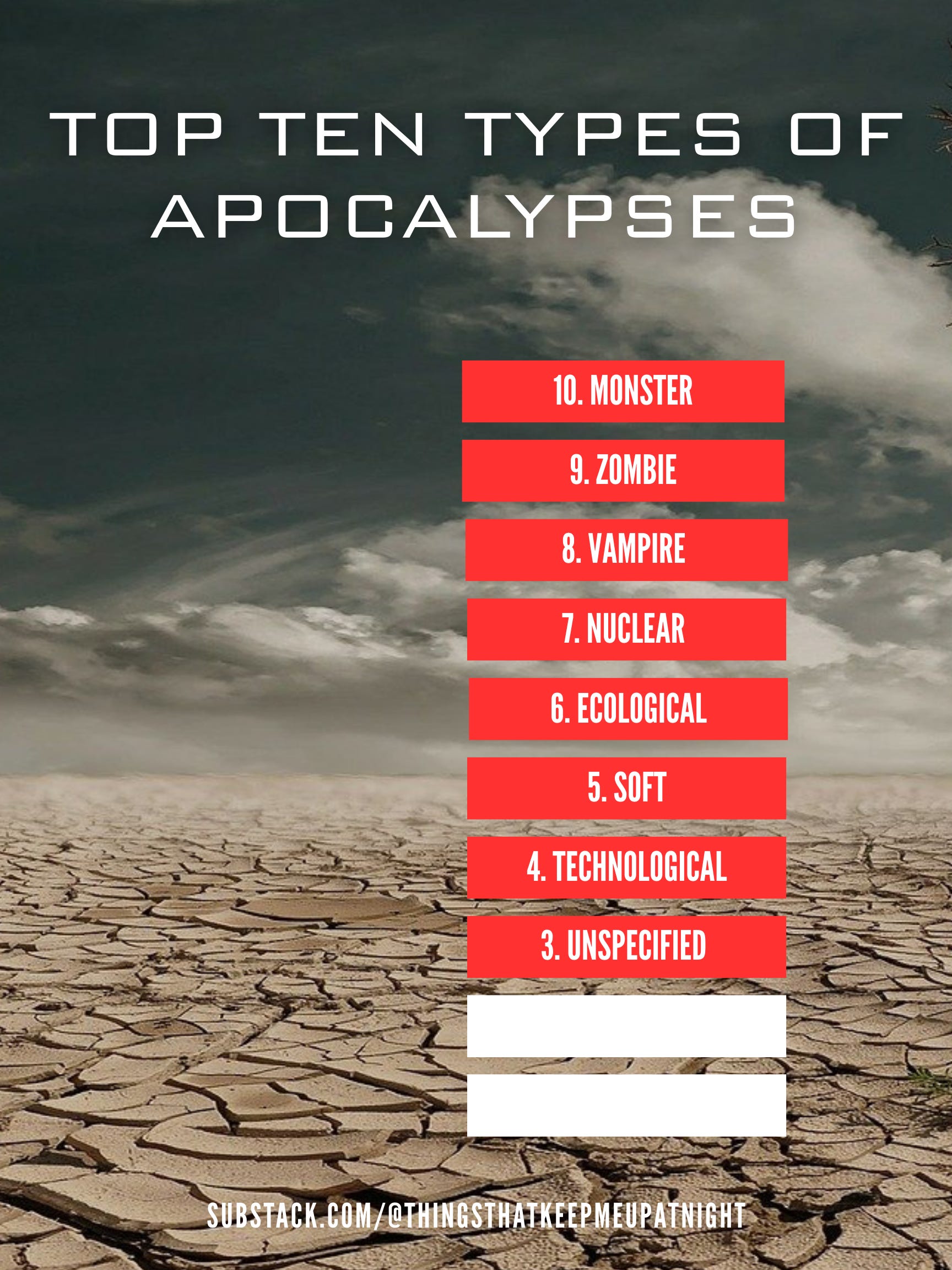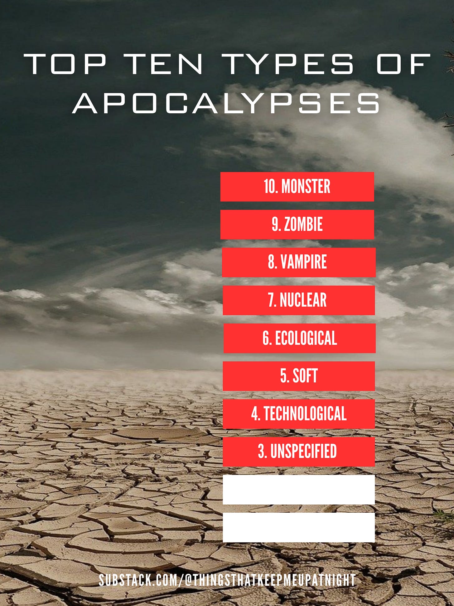 The Autumn of Apocalypses continues with number three on my Top Ten Types of Apocalypses list: Unspecified Apocalypse. This is a bit of a strange entry, because it could include any of the previous types of apocalypses. But knowing that the world is over while having to wait to find out exactly why usually keeps me riveted as a reader or viewer. And it is always interesting to see how humans adapt to the new conditions of these unknown apocalypses. Which caused me to look into which countries around the world are best equipped to protect their citizens in the event of an apocalypse. But first